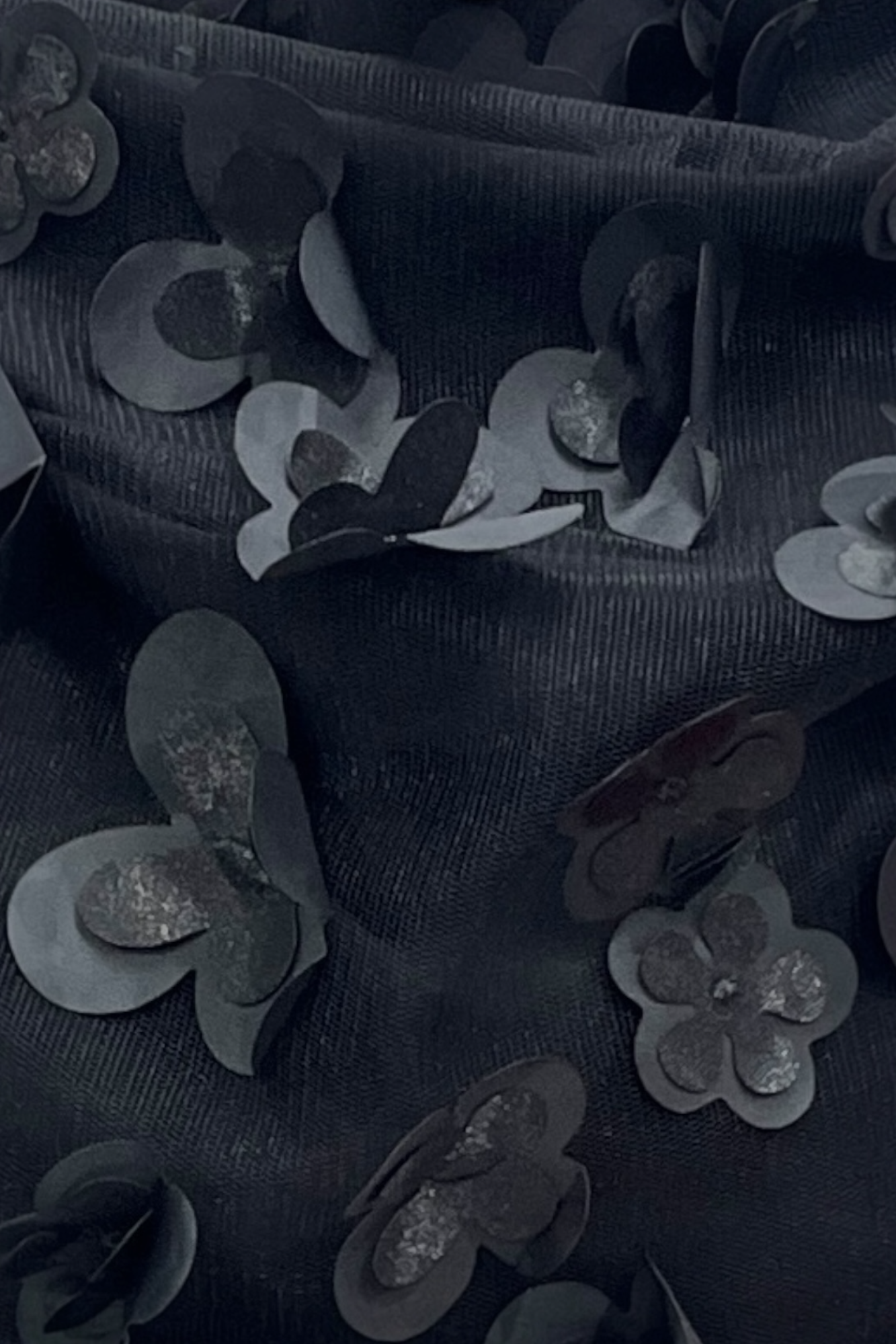 Extravagant dress with floral tulle and a Carmen collar. This breathtaking dress by Vincenzo Allocca combines artistic sophistication with exceptional comfort . The absolute highlight: an extravagantly crafted tulle trim , artfully decorated with delicate floral appliqués . This floral interplay lends the piece a romantic lightness and makes it a real eye-catcher . The Carmen collar elegantly highlights the décolleté and underscores the feminine charisma. The gently flowing jersey fabric envelops the body, perfectly balancing comfort and elegance. Whether you're looking for an unforgettable evening outfit or planning your grand entrance at a special event, this dress is guaranteed to turn heads . Featuring 3/4-length sleeves and side pockets.