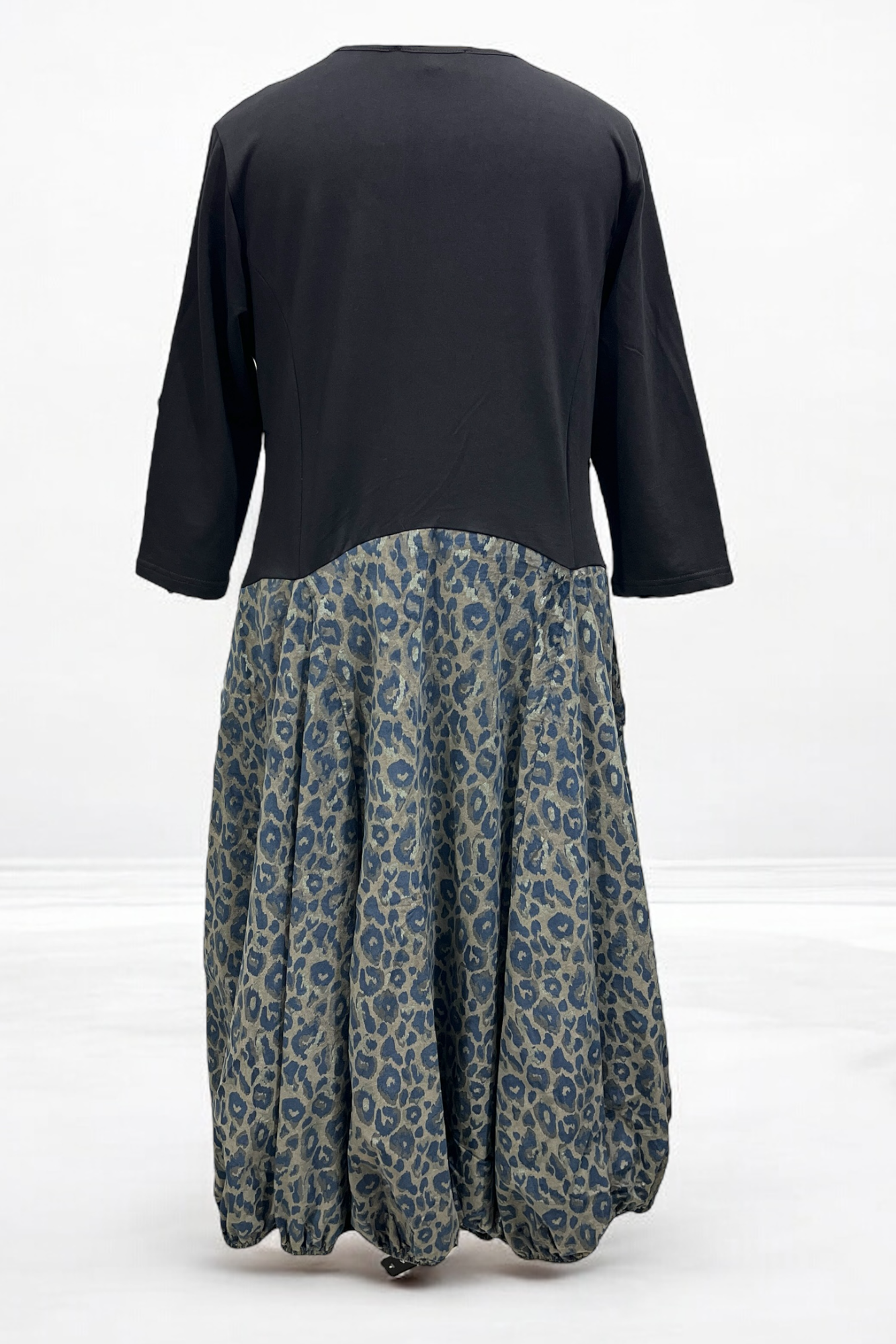 Jersey Kleid mit Rock im Leo-Style von Vincenzo Allocca. Oberteil bestehend aus angenehmer schweren Jersey Baumwolle. Rundhals-Ausschnitt und 3/4 Armlänge. Rock aus Velvet-Stoff im Leo-Style mit seitlichen Innentaschen. Das eingearbeitete Gummi im Saum sorgt für die typische Ballon-Form. Einzigartig. Typisch Vincenzo Allocca.