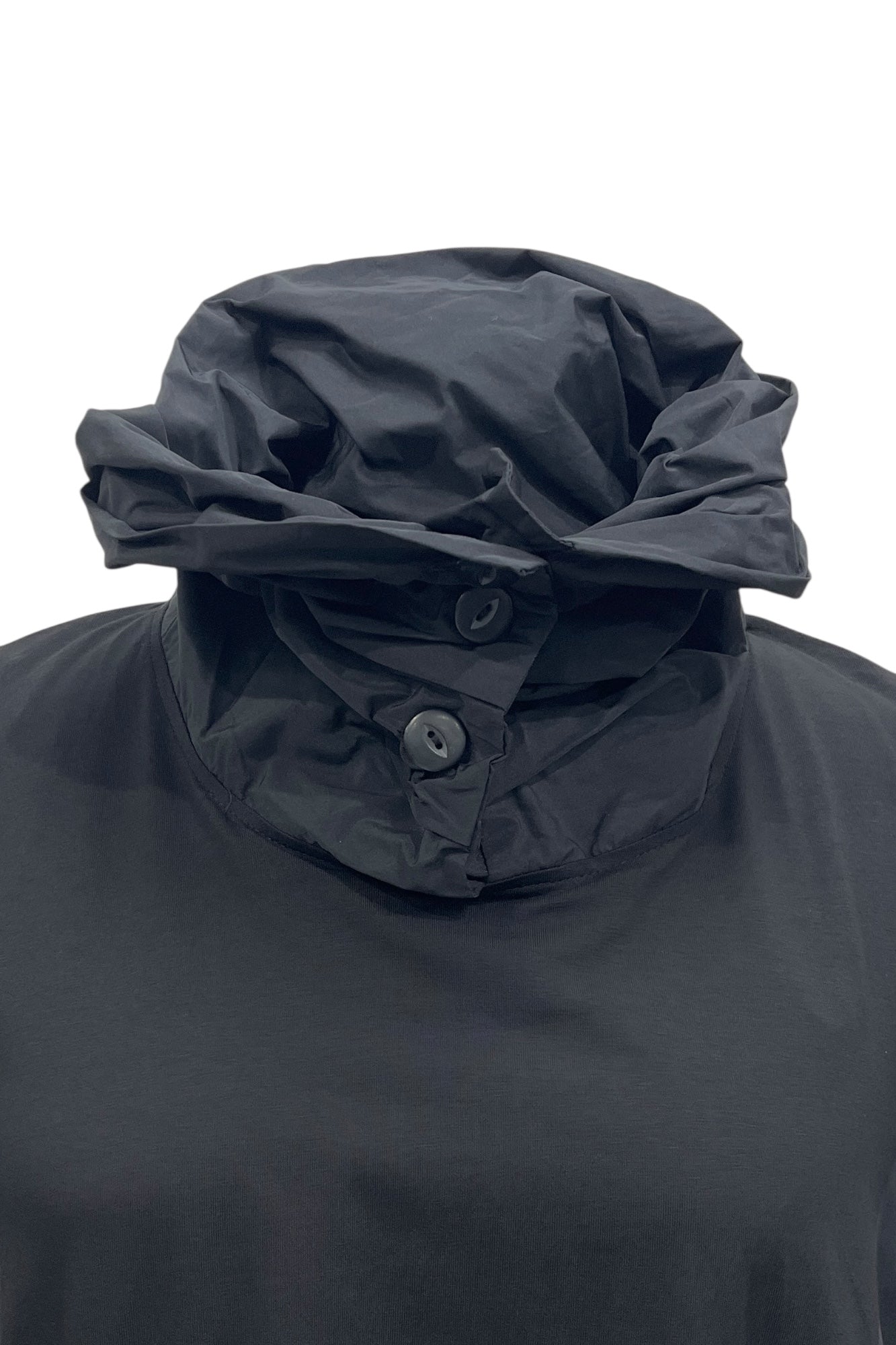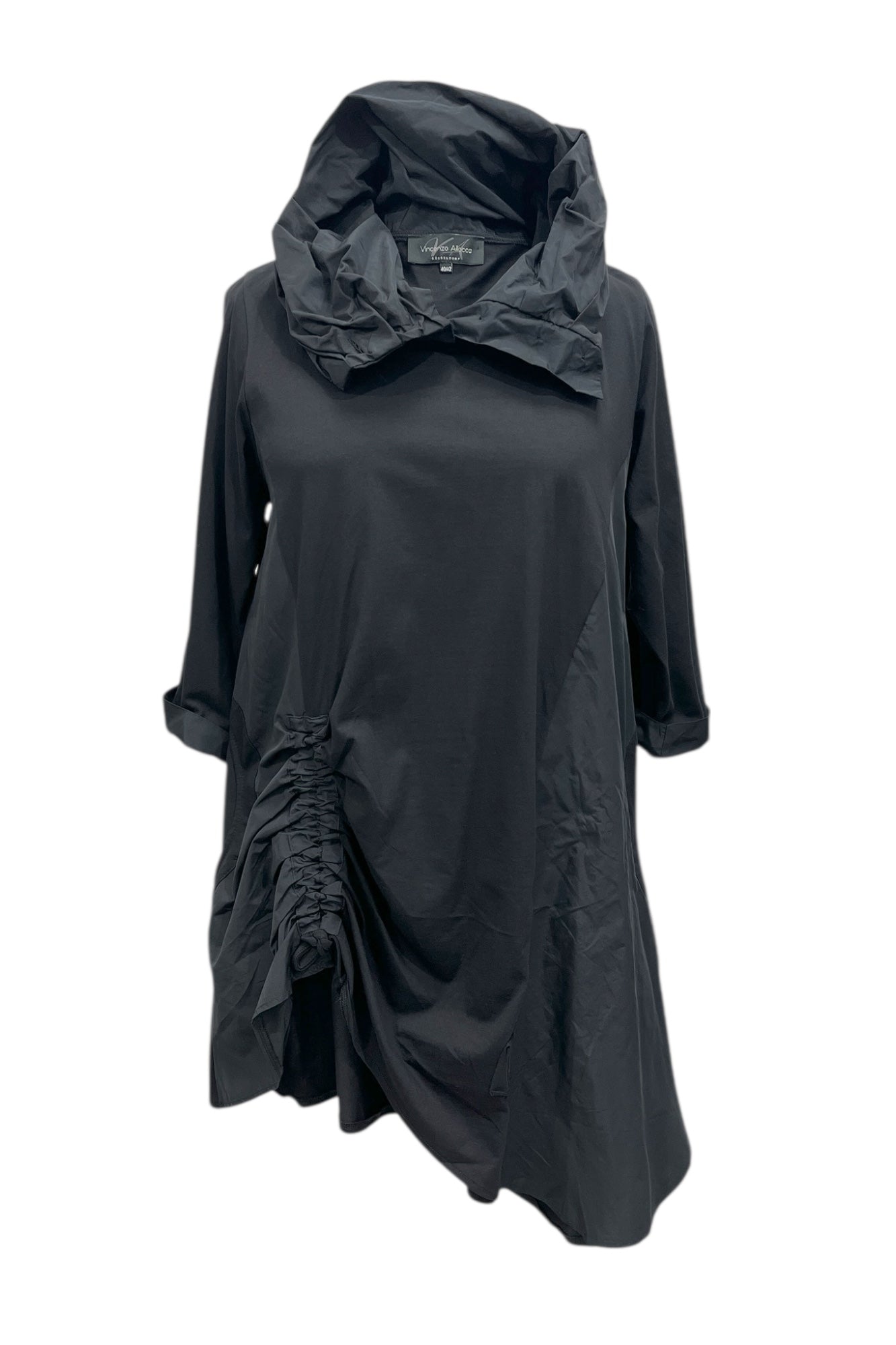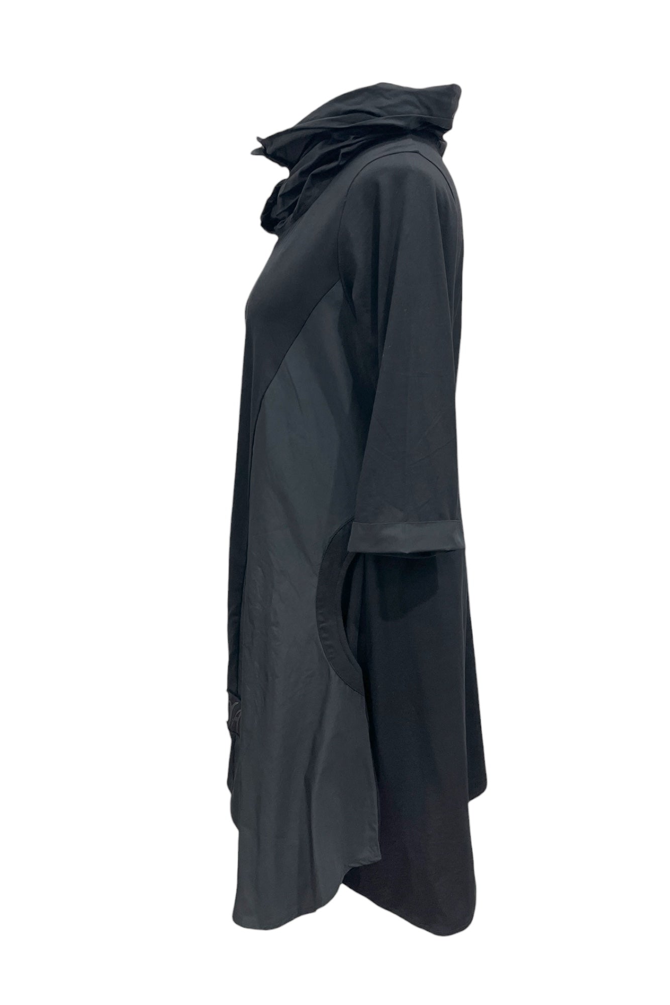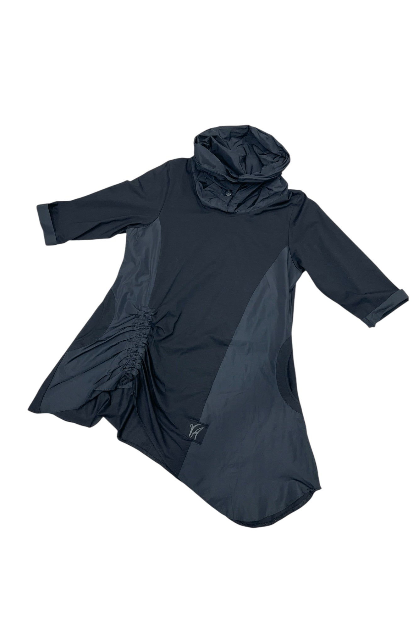 Aufwendig verarbeitete Tunika im asymetrischen Schnitt. Der Kragen ist komplett aus hochwertigen Memory-Stoff und kann individuell mit Knöpfen geschlossen oder drapiert werden. Weitere Einsätze aus Memory befinden sich im Vorderteil. Mit seitlichen Eingrifftaschen und Tunnelzug zum raffen.